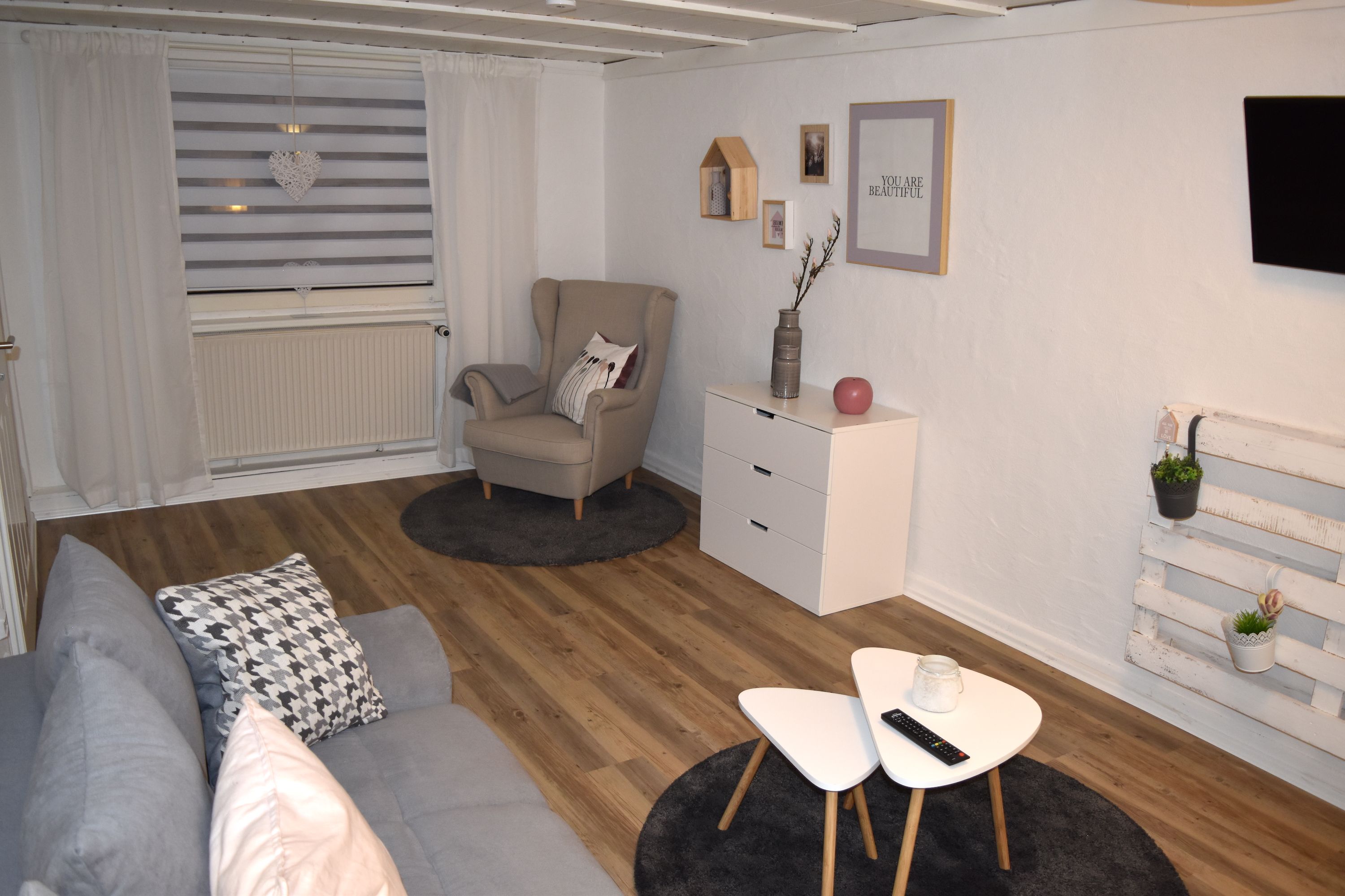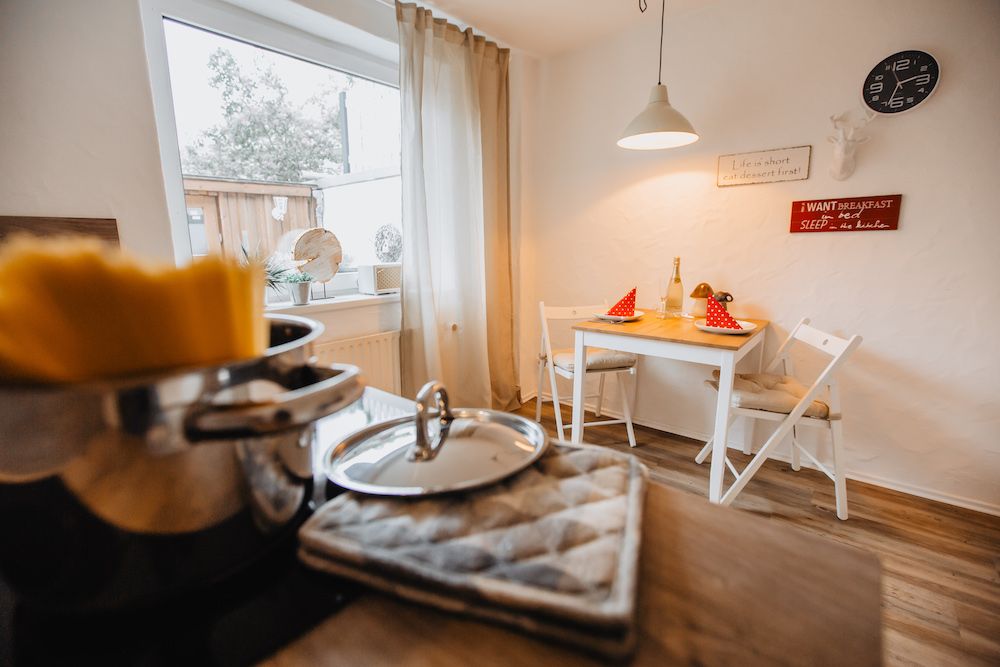 Das Appartement "die Sechs" befindet sich im Gebäude in der Hellenstraße im Erdgeschoß und verfügt über einen seperaten Eingang und Sitzecke im Garten. Die Küche mit kleinem Esstisch ist komplett ausgestattet. Ein großer Esstisch bietet Platz genug für gemütliche Spieleabende mit der Familie. Auch das geräumige Wohnzimmer mit großem Sofa bietet genug Platz für einen Fernsehabend. Im Badezimmer steht eine Waschmaschine zur Verfügung.